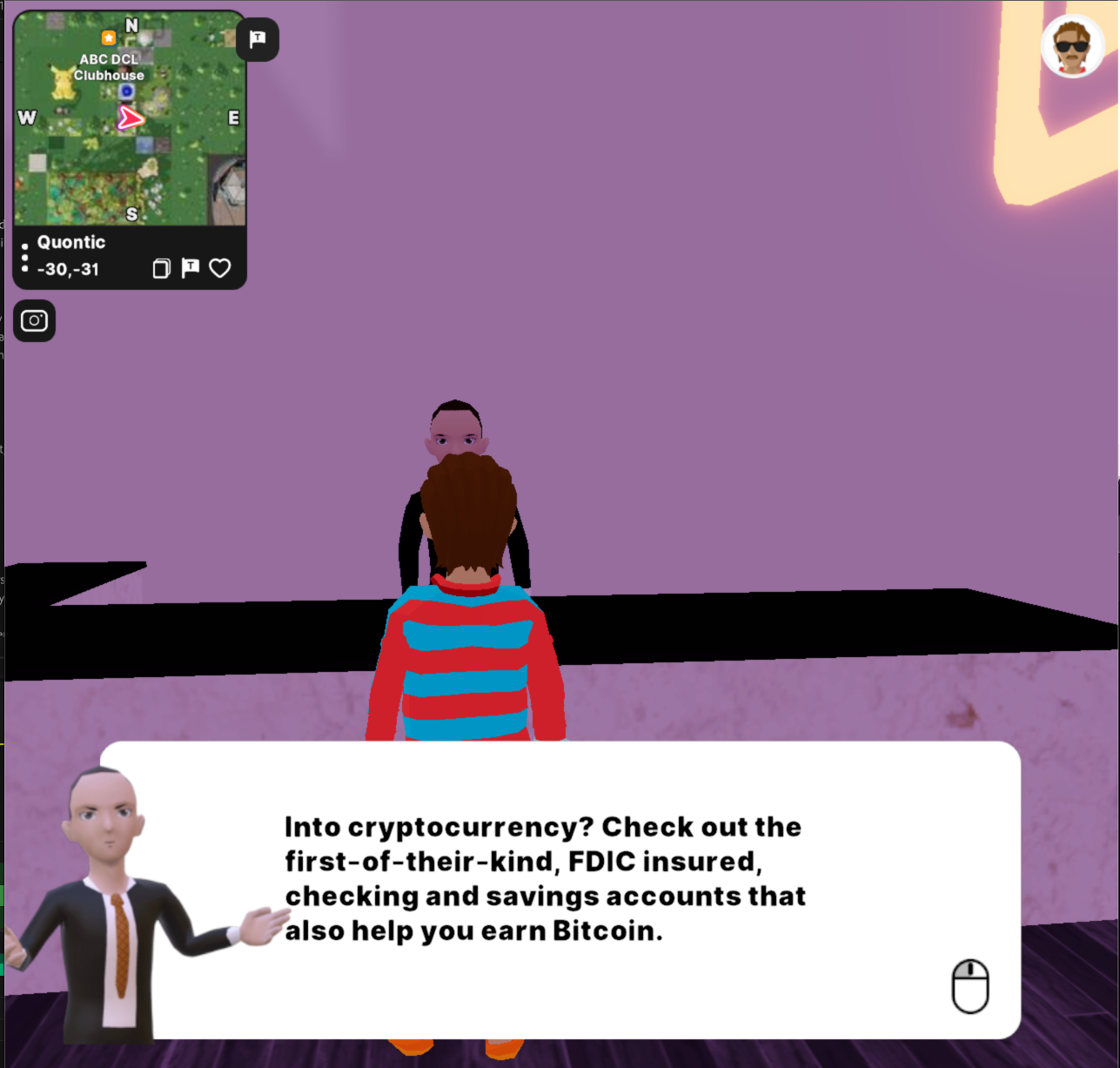 Κοιτάζοντας γύρω από το φυλάκιο της τράπεζας metaverse, μπορείτε να δείτε μερικές αφίσες που χρησιμεύουν ως υπερσύνδεσμοι σε διάφορες σελίδες στον ιστότοπο της Quontic που δεν είναι metaverse.